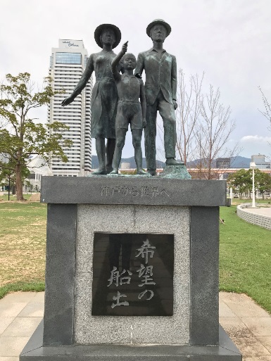 希望の船出モニュメント:メリケンパークの最南端にあり、神戸港からブラジルへの移民を記念するためのものです。ブラジルの方角を指差し、新しい土地への希望を持った姿のモニュメントです。